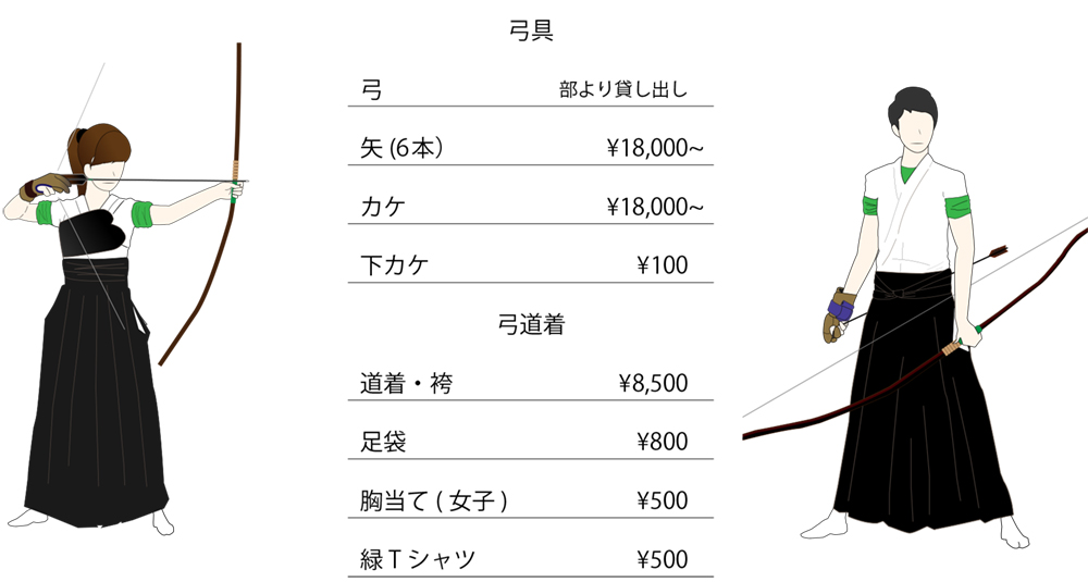 部費として月1,000円を徴収します。その部費で部の運営費用、弦などの弓具・備品を購入します。