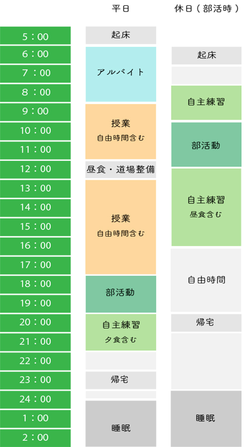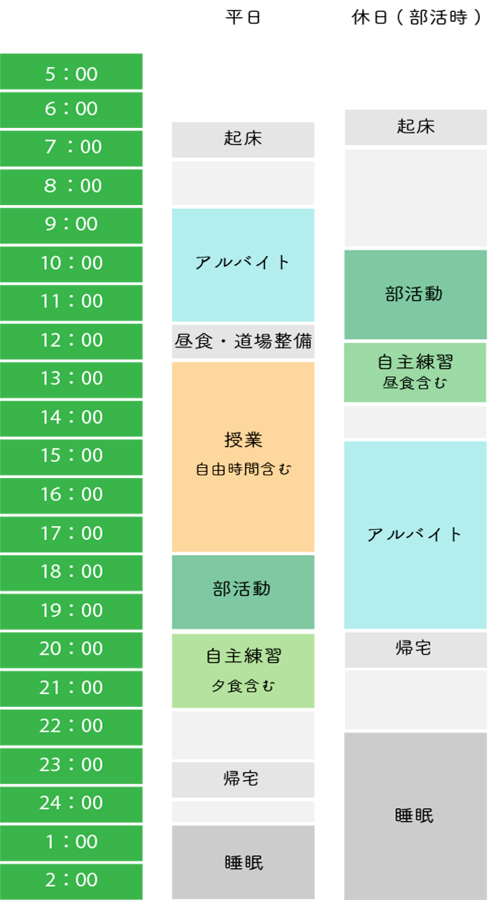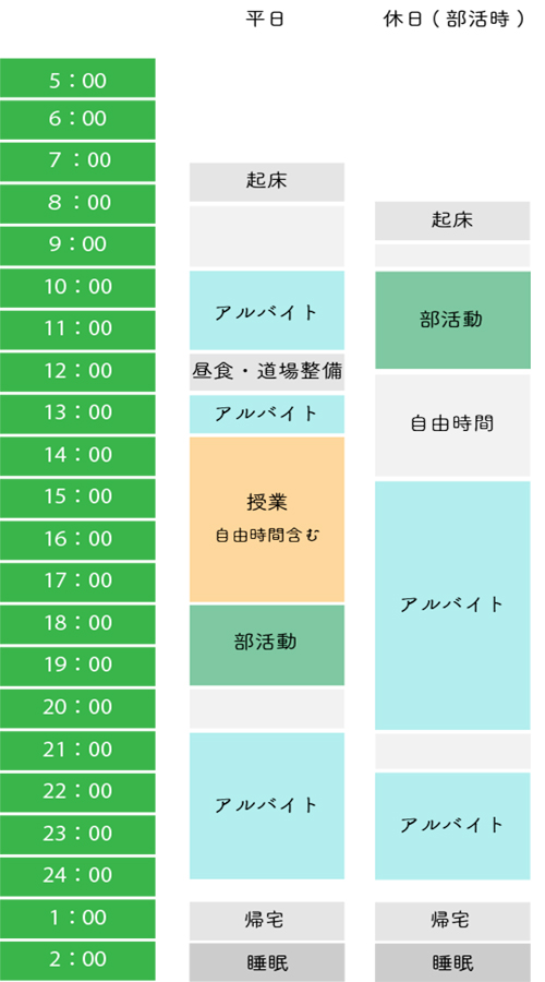 1〜2年生時のスケジュールとしては、平日午前・午後は授業を受けて、部活が終わった後にアルバイトをしていたことが多かったですね。