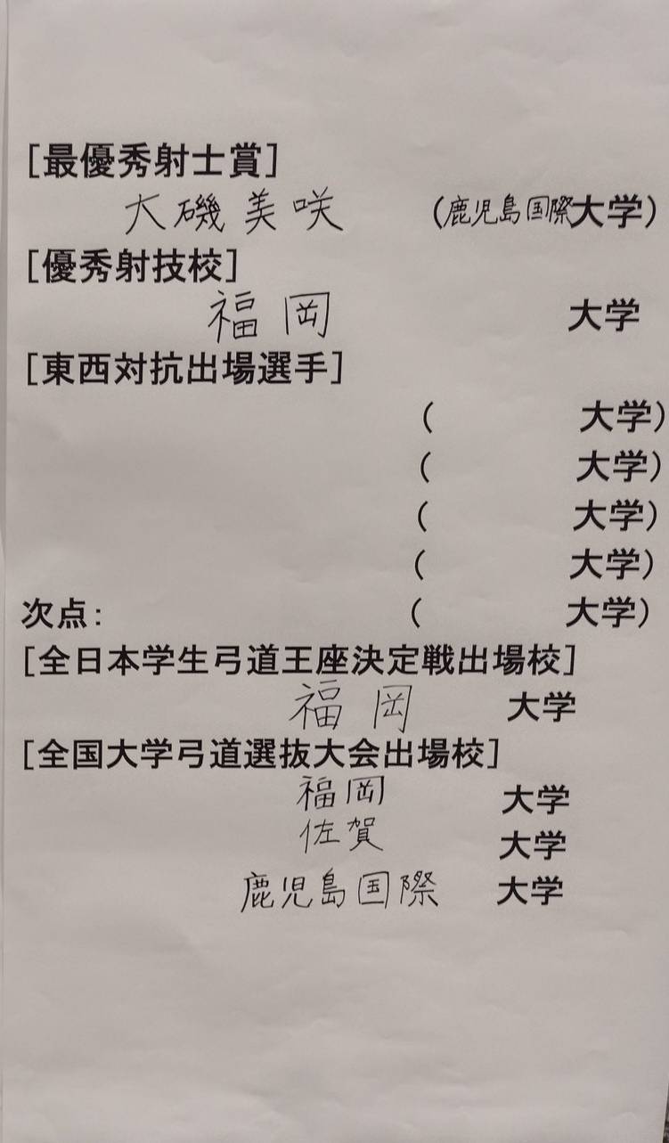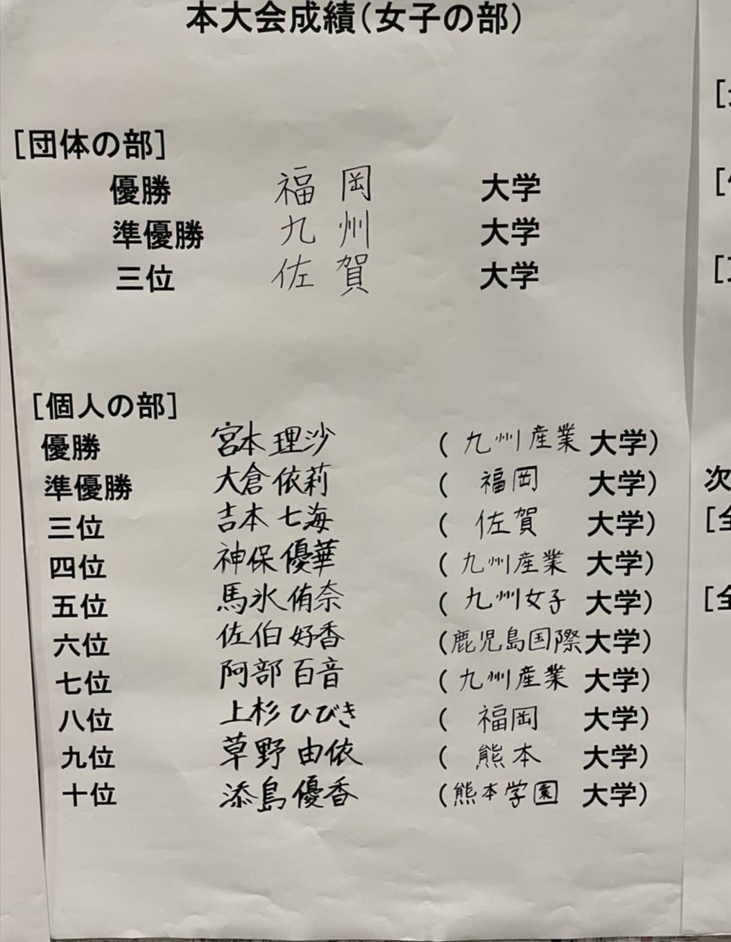 ※失念のため記載。【第45回女子東西学生弓道選手権弓道選抜対抗出場選手】 大磯美咲 (鹿児島国際大学2年生) 大倉依莉 (福岡大学4年生) 吉本七海 (佐賀大学2年生) 上杉ひびき(福岡大学1年生)