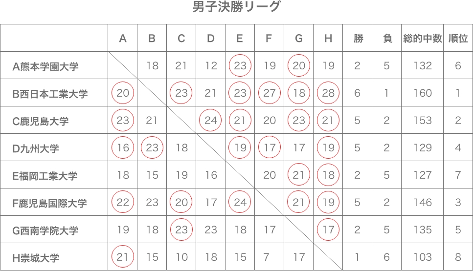 | 結果 | 【男子団体の部】 団体6位 (総的中数132中、2勝5敗)