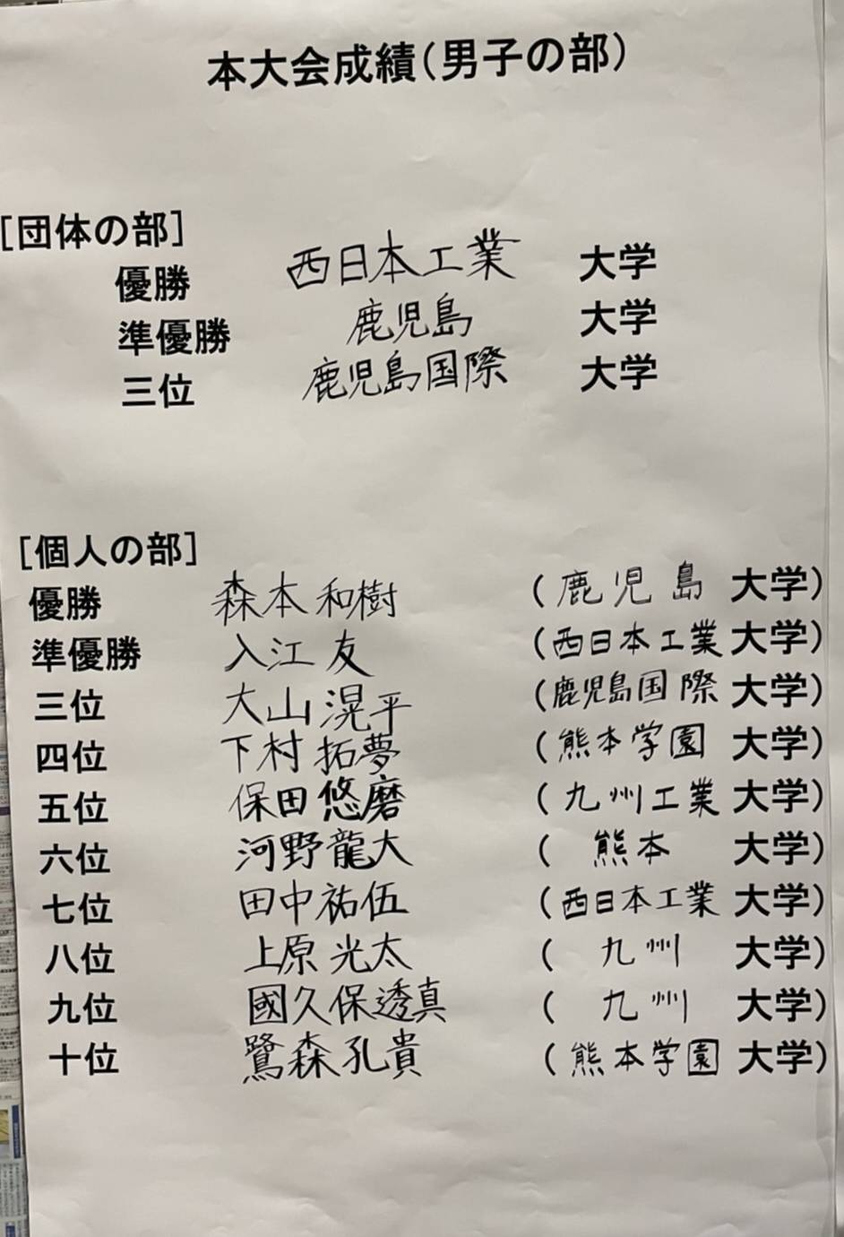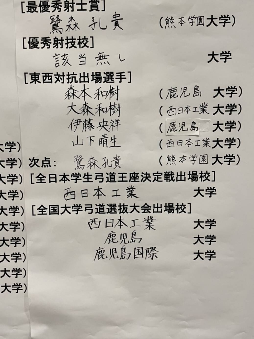 【男子個人の部】 4位下村拓夢(3年生)、10位鷺森孔貴(3年生) 【最優秀射士賞】 鷺森孔貴(3年生) 【東西対抗:次点】鷺森孔貴(3年生) |